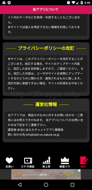 アプリには「特定商取引法に関する表示」はないが、「運営社情報」が記載されている。