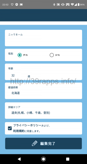 初回起動時にニックネームや居住地域などを登録する項目がある。
