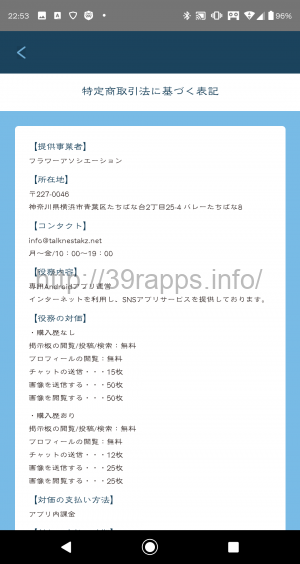 アプリ内では特定商取引法に基づく表示が確認できる。提供事業者名は「フラワーアソシエーション」とある。