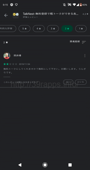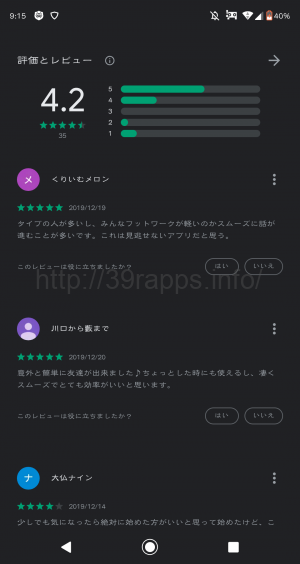 次にレビューコメントを見てみよう。このアプリでは、Playストアのコメント欄は肯定的な評価で溢れている。