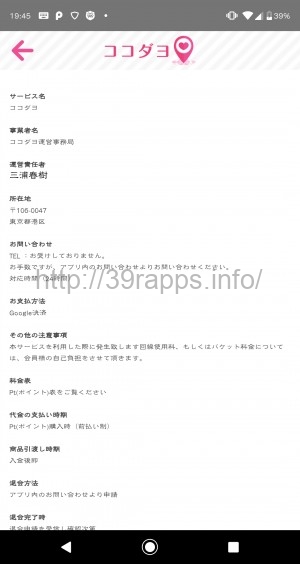このアプリは「出会いアプリではない」とアプリの説明に記載されているが、オンラインでの資金決済が伴う以上、「特定商取引法表示」に該当するような正確な記載が求められることは言うまでもないだろうな。
