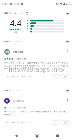 評価数は432件。マッチングアプリ系としては少なめだな。