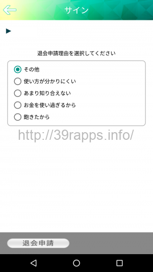 アプリ右上の設定ボタン(歯車のマーク)から設定メニューに入り、「ヘルプ」「退会」と進むと退会理由を選択する項目へ移動する。
