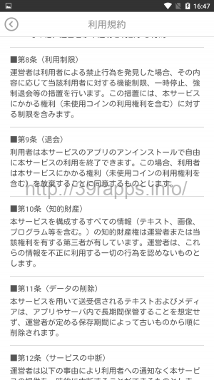 アプリの退会は、「利用規約」内に記載があるとおり、アプリ内の退会フォームなどではなく、アプリをアンインストールすることで行うようになっている。