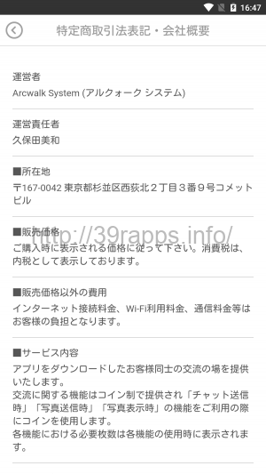 アプリ内からは、「特定商取引法表記・会社概要」を確認することができる。