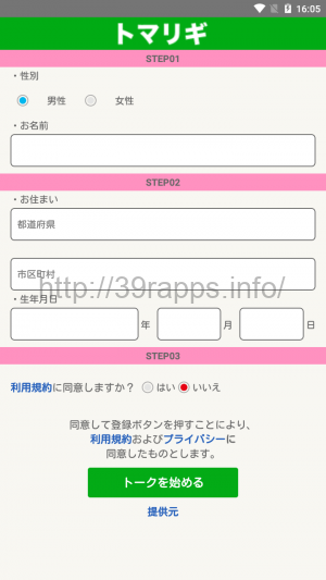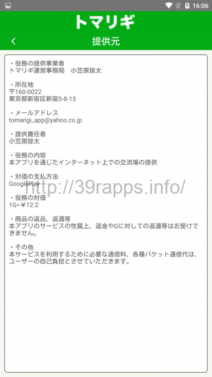 アプリ内では、「提供元」という項目があり、ここから確認ができるが、これによると、「役務の提供事業者」は「トマリギ運営事務局 小笠原諒太」とある。