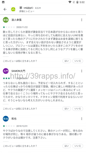 批判的なレビューには、「やっと待ち合わせしても絶対に会えない」「LINEを教えて貰ったら他のアプリに行かされた」「サクラの巣窟アプリ濃厚!」といった、サクラの存在を疑わせるレビューが並んでいるな。