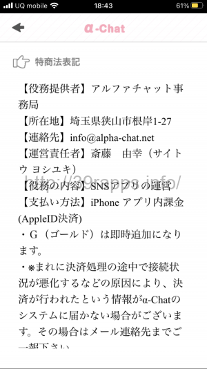 また明らかにインターネット異性紹介事業に該当するので、出会い系規制法を遵守しているかも要チェックだ。