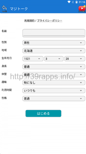 マジトークにおいても、初回起動時において生年月日を登録する。