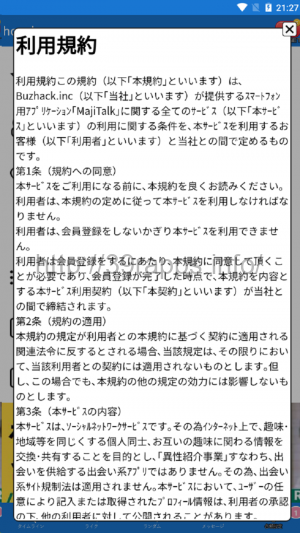 しかし、このアプリには特商法表記がなく、アプリ内から確認できる情報は、「利用規約」内に記載されている「Buzhack.inc」という社名だけだ。