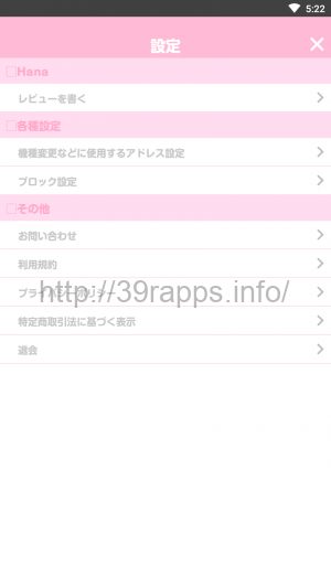 「Hana」を退会するには、メイン画面右下にある「まいぺーじ」から、「各種設定」に入り、一番下にある「退会」ボタンを押す。