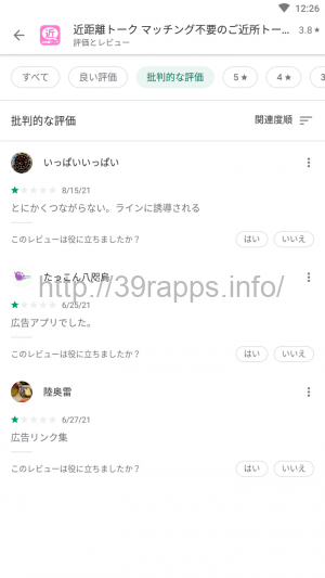 批判的なコメントに絞って見てみると、「広告アプリでした」「広告リンク集」といったコメントが見え、利用する前からこのアプリがどのようなものかある程度判断ができてしまった。