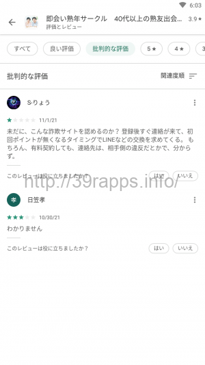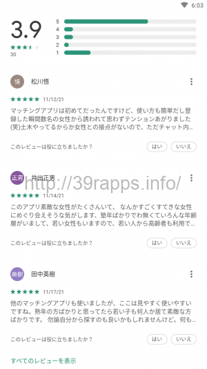 Playストアでの「即会い熟年サークル 」の星評価の平均は3.9と「まあまあ良い」といった程度か。