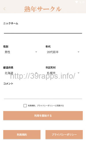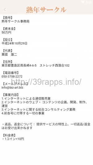 アプリ内からは特定商取引法に関する表示が確認できるが、これによると「商号」は「熟年サークル事務局」とある。