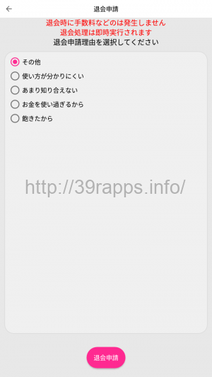 - 退会理由を選択し、「退会申請」ボタンをタップする。