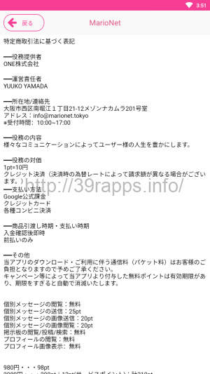 「マリオネット」のアプリ内からは、「特定商取引法に基づく表記」が確認できる。