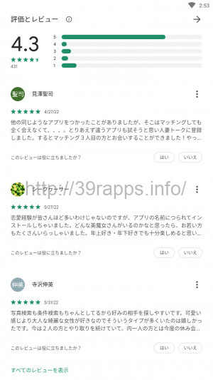 「人妻トーク」のPlayストアでの星評価は4.3と、中の上ぐらいといった評価だろうか。