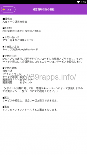 アプリ内の「特定商取引法の表記」を確認すると、まず「提供元」の項目には、「人妻トーク運営事務局」という名前が見える。
