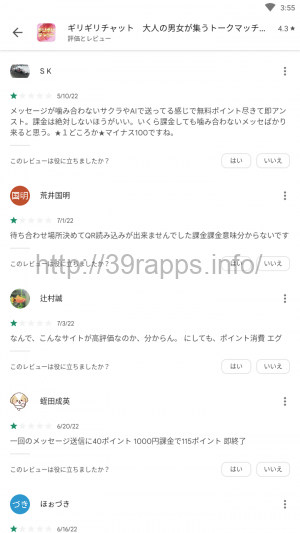 一方批判的なレビューコメントを見てみると、「メッセージが噛み合わないサクラやAIで送ってる感じで無料ポイント尽きて即アンスト。」「なんで、こんなサイトが高評価なのか、分からん。」といった辛辣なレビューが並んでいる。