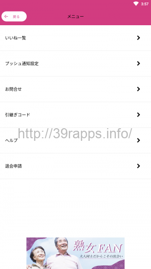 - メイン画面の右上にあるメニューボタンから「退会申請」を選ぶ