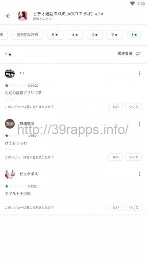 批判的なコメントでは、「ただの詐欺アプリで草」といった短文の低評価コメントが並んでいる。