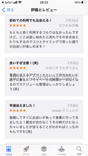 レビューはいい評価のレビューのみで、「登録をしてすぐに出会いがあって食事に行きました」「調子に乗るとプライベートの時間が一切なくなる」とかなり良い事が書かれている。