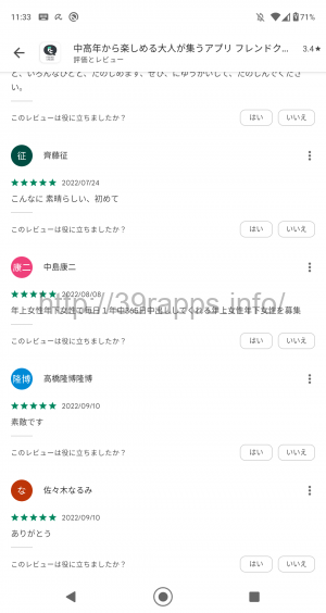 続いてレビューコメントのほうを参照してみると、「このアプリは、とても、可愛い人が、たくさん、いて、とても、たのしめますよ。」「こんなに素晴らしい、初めて」など、もはや日本語が怪しいのか精神状態が怪しいのかわからない絶賛レビューが並んでいる。