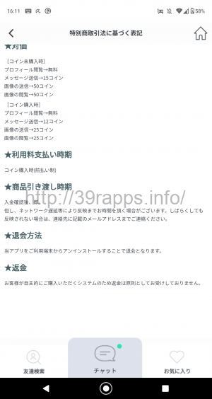 アプリ内からは特定商取引法の表記が確認できる。