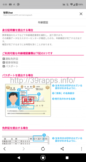 この「秘密Chat」においても、自分で年齢を入力したあとに免許証や保険証の提出が求められた。