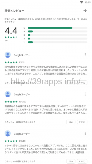 続いてレビューコメントのほうを参照してみると、「様々な情報を交換できたり学べる空間でもあり素敵な人達との楽しい時間を作ることも出来る最高のアプリだと実感したので最も高い評価を付けました。」「オシャレ好きにはたまらないエッセンス満載のアプリですね。」などのコメントが寄せられている。