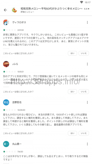 低評価のコメントでは、「ここは大半がなりすましが多く、課金しても会えずじまい。」「非常に悪質なアプリです。サクラしかいません。」「星なんか付けられない程ひどい。」など、怒りのコメントで溢れかえっている。