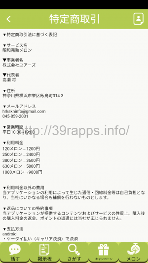 アプリ内からは「特定商取引法に基づく表記」が確認できる。