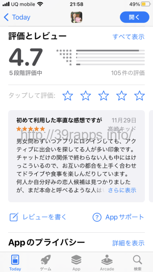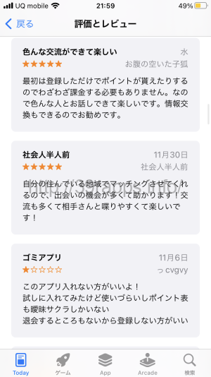 絶賛レビューは何件あっても参考にならないが、サクラ報告レビューは1件あるだけで一気に悪徳アプリ濃厚となる。