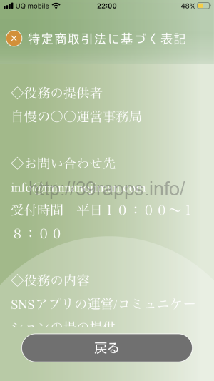 特商法のページはあるものの、運営会社名とメールアドレスしか載っていない。