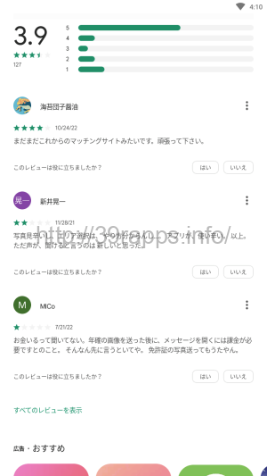 批判的なコメントでは、「アプリが、使い辛い。」「お金いるって聞いてない。」などのコメントが見えるが、サクラや業者に関するコメントは見えないな。