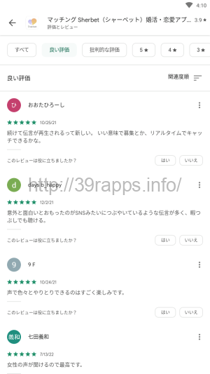 Playストアにおける「Sherbet(シャーベット)」の星評価の平均は3.9、評価数は127件とあまり件数が集まっていない。