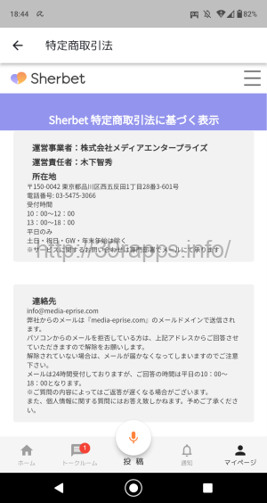 アプリ内の「特定商取引法」のページからは、アプリの運営会社に関する情報が確認できる。