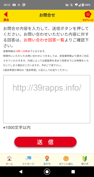 アプリ右上にある「マイページ」から、「お問い合わせ」を選択する。
