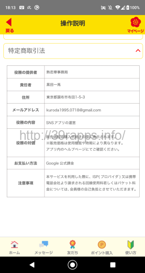 アプリ内の特商法表記によれば、「役務の提供者」は「熟恋華事務局」とある。
