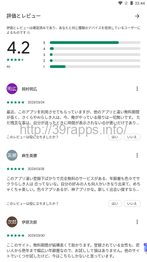 レビューコメントのほうを参照してみると、まず肯定的なレビューコメントでは「さくらやAIらしき人は、今、俺がやっている限りは一切無いです。」「サクラらしき人は合ってないな。」と、やたらと「サクラがいない」ことをアピールするようなコメントが目立つ。
