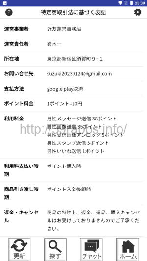 アプリ内から確認できる特定商取引法に基づく表記によれば、運営事業者は「近友運営事務局」とある。