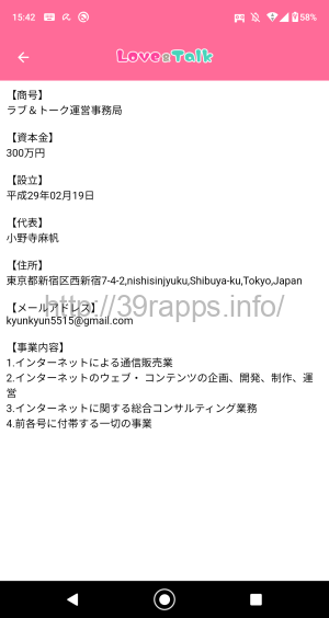 アプリ内の特商法表記によると、『商号』の項目には「ラブ&トーク運営事務局」とある。