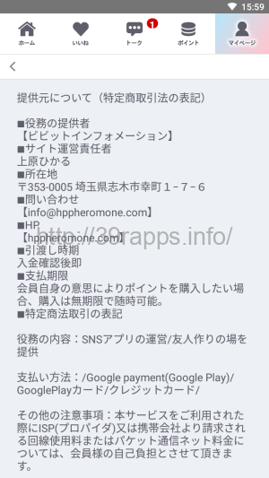 アプリ内の特定商取引法の表記によると、「役務の提供者」は「ビビットインフォメーション」という名前の事業者のようだ。