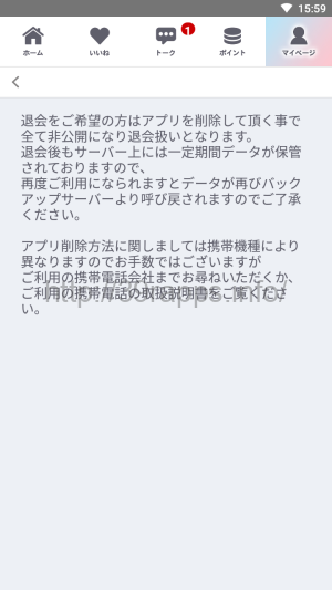 ヘルプを参照すると、どうやらアプリを退会するには、アプリをアンインストールするしか方法がないようだ。