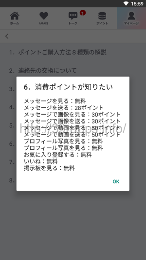 中を見てもポイント代の異常な高額さや、放置していてもサクラからメールが届いたことで、このアプリは悪質アプリであると断言できた。