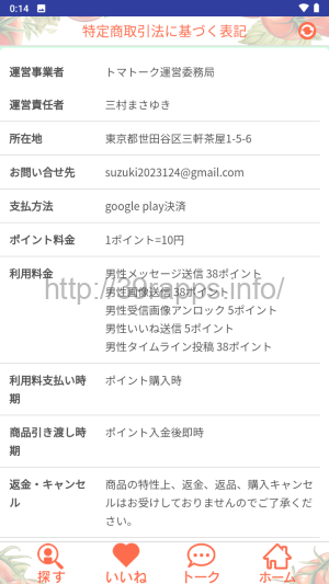 アプリ内の「特定商取引法に基づく表記」によると、「運営事業者」の欄には「トマトーク運営委務局」とある。
