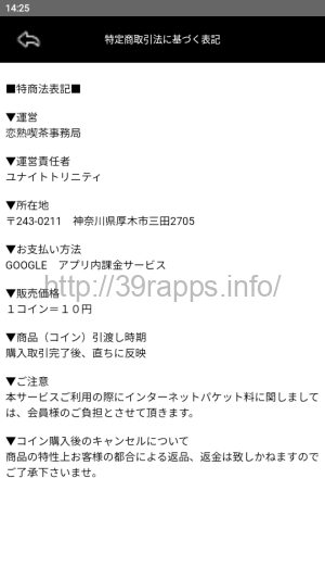 アプリ内「特定商取引法に基づく表記」によれば、「運営」の欄には「恋熟喫茶事務局」、「運営責任者」の欄には「ユナイトトリニティ」とある。