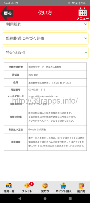 アプリ内「特定商取引法」の表示によると、「役務の提供者」の欄には「株式会社サーブ 熟年さん事務局」とある。