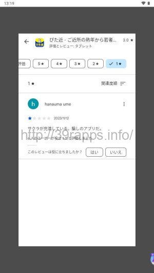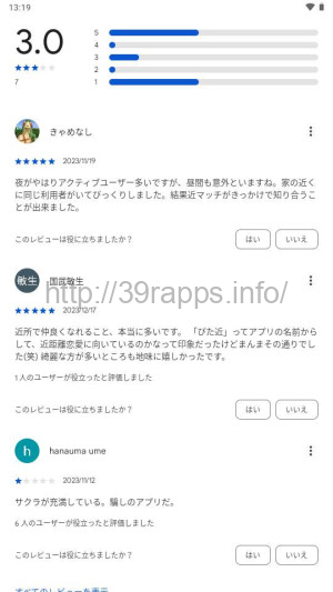 Playストアでの「ぴた近」の星評価の平均は3.0と、中の中といったところか。