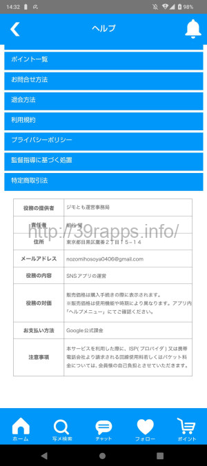 アプリ内「特定商取引法」の表記によれば、「役務の提供者」は「ジモとも運営事務局」とある。